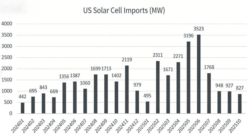 PVTIME – Data from US Customs shows that total solar cell imports from January to October 2025 amounted to 17.9GW, marking a 59% increase compared to the 11.3GW recorded during the same period in 2024. Imports increased steadily from the beginning of 2024 until the middle of 2025, peaking at 3,523MW in June, before decreasing in the second half of the year.
