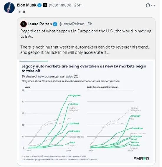 PVTIME – An X user posted: “Regardless of what happens in Europe and the U.S., the world is moving to EVs. There is nothing that western automakers can do to reverse this trend, and geopolitical risk in oil will only accelerate it….” Elon Musk replied with “True.”