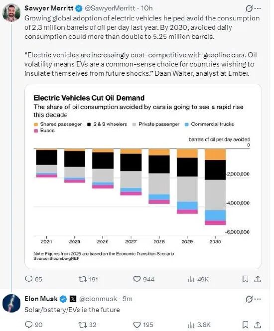 Separately, EV analyst Sawyer Merritt stated: “Growing global adoption of electric vehicles helped avoid the consumption of 2.3 million barrels of oil per day last year. By 2030, avoided daily consumption could more than double to 5.25 million barrels. Electric vehicles are increasingly cost-competitive with gasoline cars. Oil volatility means EVs are a common-sense choice for countries wishing to insulate themselves from future shocks.” Musk responded: “Solar/battery/EVs is the future.”
