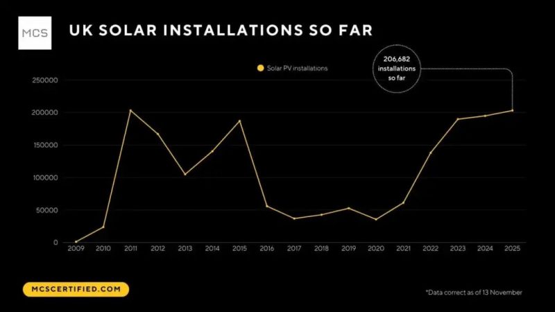 PVTIME – According to data from the Microgeneration Certification Scheme (MCS), which tracks annual rooftop renewable deployments, the UK has set a new sector record with 206,682 rooftop solar PV installations in 2025, taking the total number of certified small-scale solar systems across the country to 1.85 million.